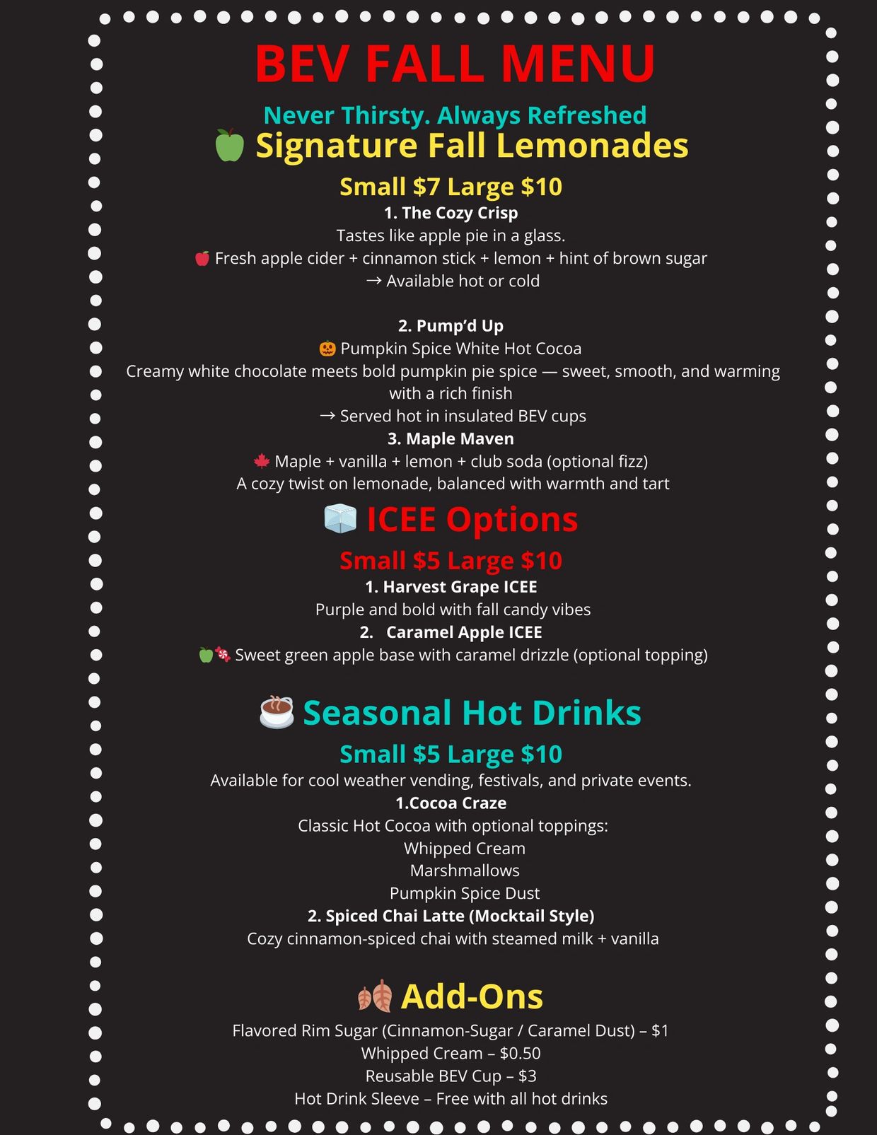 Warm up your taste buds with handcrafted seasonal drinks made to match the mood of fall. From our spiced hot cocoa and pumpkin-inspired mocktails to crisp apple lemonades and colorful ICEEs, BEV is serving up cozy in every cup. Whether you’re sipping under the changing leaves or celebrating at a fall festival, our flavors are here to make your moments sweeter — and Never Thirsty.