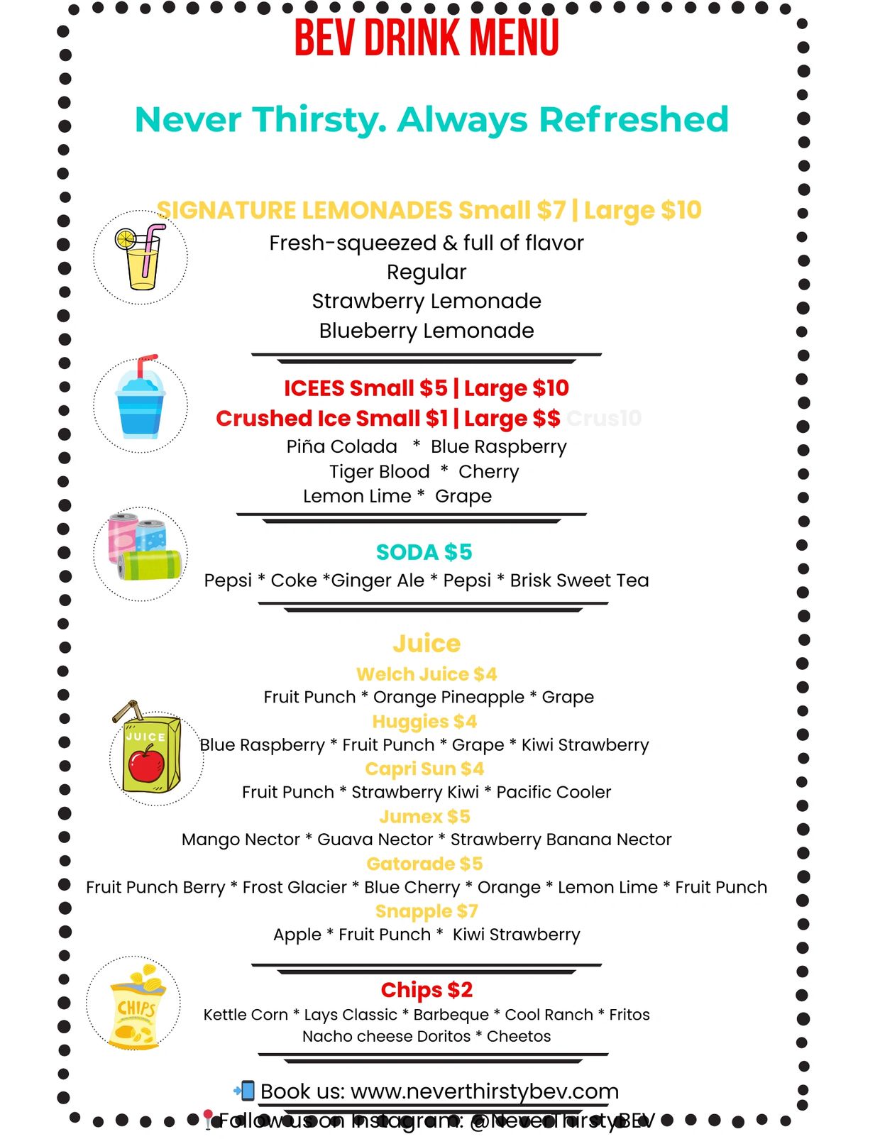From handcrafted lemonades to colorful ICEEs and playful Capri Sun mixes, BEV brings you drinks that are as bold and refreshing as your vibe. Whether you're cooling off at a festival, renting our trailer for your next event, or just craving something fun and flavorful — our menu is made to keep you Never Thirsty. Every sip is poured with personality, family-friendly fun, and a splash of BEV attitude.